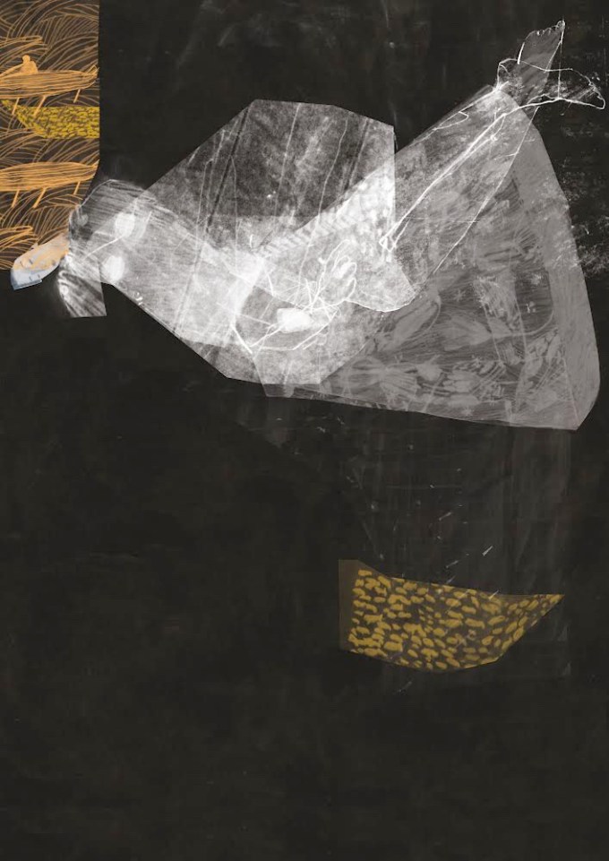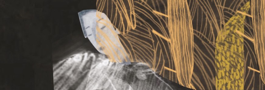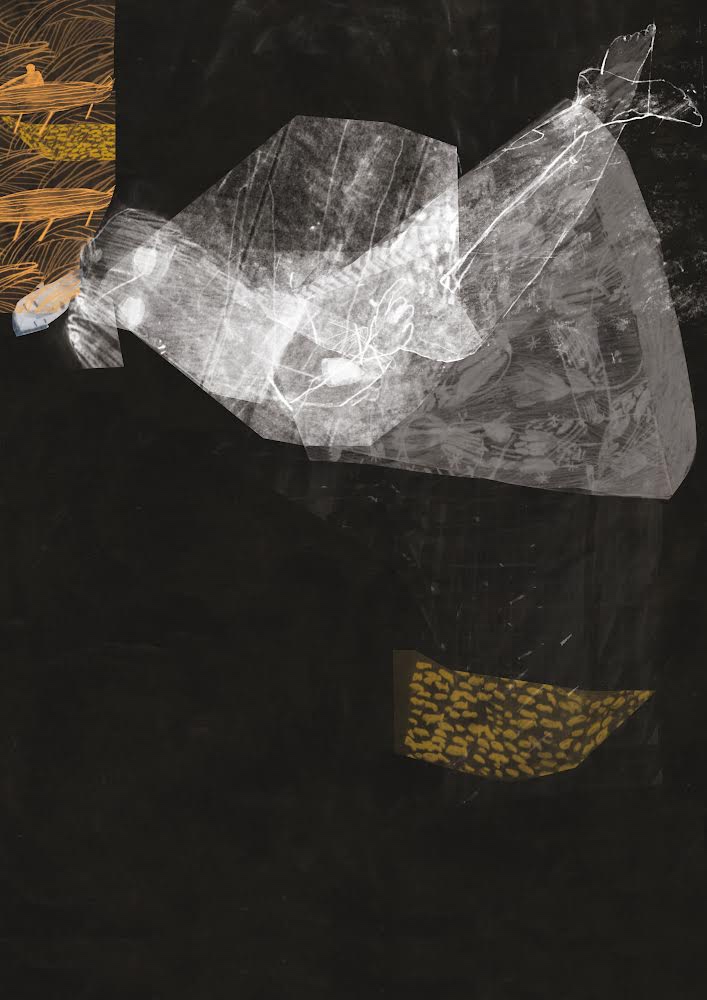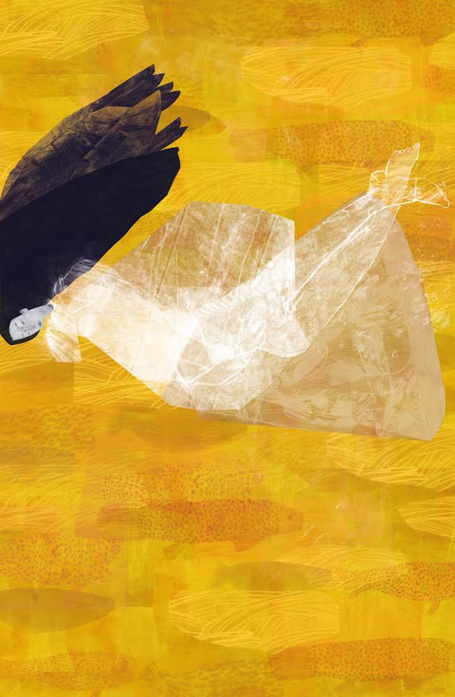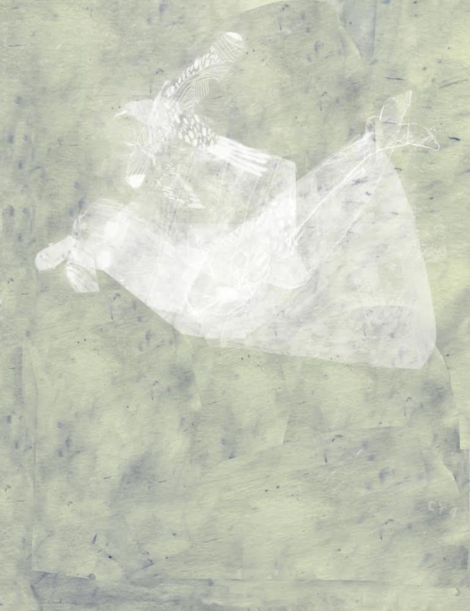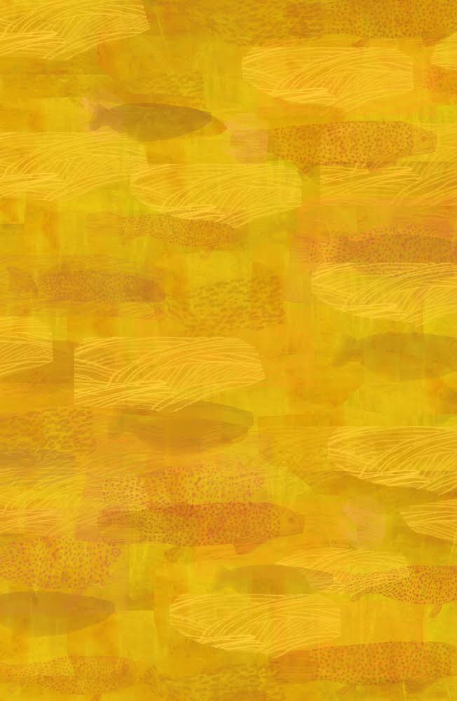 The final background is above, without the figure you can see the rows of fish and the tangled patterns that might be hair. Brian built the figure on top of this to create an image that has layers and texture.