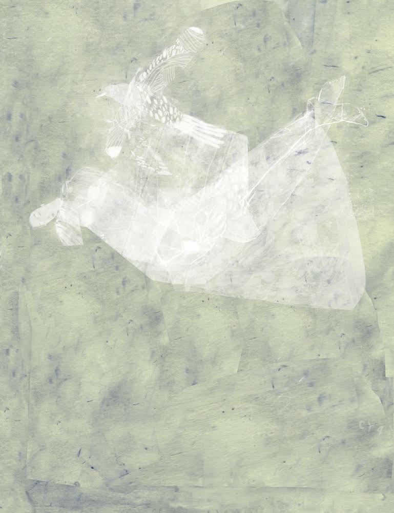 As you move through the images you can see Brian starting to dig a little more deeply into the ideas. The bird exits the frame and is replaced by shapes that begin to look more like fish, even a rowboat moving through the hair of the figure. In the darker version above I love the texture in the dress, the oddly large feet that almost become a tail. Eventually we settled on the figure and Brian started to work on a lighter background.